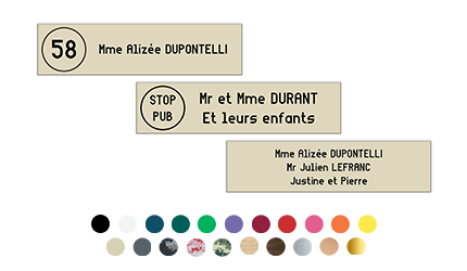 Découvrez une sélection de plaques porte-noms gravées et adhésives pour boites aux lettres au format 99 x 24 mm. Personnalisez la façade de votre boite aux lettres en y apposant une plaque porte-noms avec les couleurs et les polices de caractères de votre choix via notre configurateur de personnalisation en ligne. Vous avez la possibilité de personnaliser plusieurs lignes. Les plaques sont personnalisées par gravure, plaques de boites aux lettres étanches et qui ne décolorent pas.